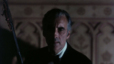 Ken gets directions to the house, but on arrival he finds he is not alone. He meets the Grisbanes (father John Carradine and daughter Sheila Keith). They're both the caretakers and original owners of the house. The hooded old woman also shows up, and turns out to be the young attractive secretary to his publisher, Mary. Mary was sent to distract him with stories of spy rings, but soon gets caught up in the real mystery of the Grisbanes.The two Grisbane brothers also arrive, played by Price and Cushing, and the current owner of the manor Lee. They are also joined by the couple from the train station where Ken stopped for directions. The Grisbanes invite everyone to have dinner with them for their "family reunion".